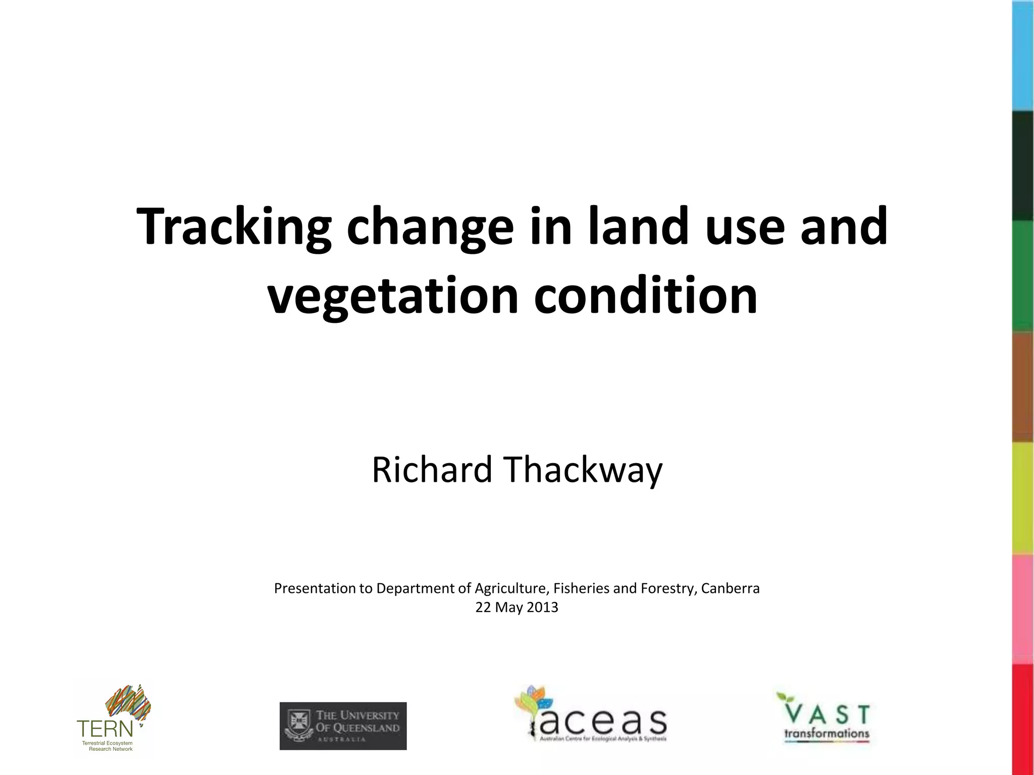 The presentation by Richard Thackway discusses tracking changes in land use and vegetation condition, emphasizing the importance of land management practices on biodiversity and ecological functions. It presents the VAST-2 methodology, case studies, and frameworks for assessing vegetation condition and transformation over time, highlighting the diverse land uses in Australia and their impacts. Finally, it outlines future directions for scaling up monitoring and engaging land managers to improve ecological outcomes.