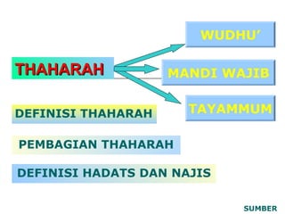 Dokumen ini menjelaskan tentang thaharah, yaitu proses bersuci yang penting dalam Islam, baik secara lahiriah maupun batiniah. Terdapat pembagian hadats dan najis serta tata cara untuk bersuci, seperti menggunakan air dan debu, serta definisi dan jenis hadats dan najis. Sumber rujukan untuk pembelajaran thaharah juga dicantumkan.
