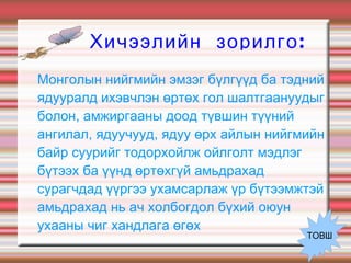 Хичээлийн зорилт: ТОВШМонголын нийгмийн эмзэг бүлгүүдийн байр суурь, түүнийг тодорхойлж, тэдний ядуурлын гол шалтаан, үр дагаврыг ойлгуулах Амжиргааны доод түвшин гэж юу болох, түүний илрэх хэлбэр ба ангилалын тухай тодорхойлж бэлтгэсэн хэрэглэгдхүүн схемийн дагуу ярилцан харьцуулж мэдлэг бүтээх Монголын нийгмийн эмзэг бүлэг тэдний эх үүсвэр, яаж энэ бүлгийн хүмүүсийг багасгах арга зам, эмзэг бүлгийнхний зайлшгүй бий болох эх үүсвэрийн тухай ярилцаж тэдэнд яаж тусалдаг болох тухай хэлэлцүүлэг хийх “ Энэ сэдийн” дагуу судалгаа “Монгол дахь эмзэг бүлгийн тухай хийж болох судалгааг багаар хуваан олон талаас нь судлах, түүнд дүгнэлт хийх жишээ нь: нийгмийн эмзэг бүлгийн хэлбэрээр нь насны ангиллаар нь ” гэх мэт судалгаа хийж болно. 1 3 2 4 - 4.