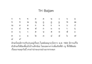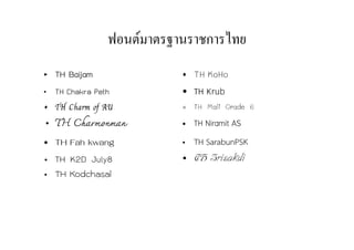 The document contains tables listing the names of various Thai typefaces ("TH") developed by the National Science and Technology Development Agency of Thailand between 1900-2000. Each typeface name is written in a 5x9 grid and includes letters, numbers, and Thai characters. There are 15 different typeface names listed.