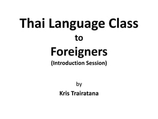 This document provides an introduction to learning the Thai language for foreigners. It covers Thai alphabets, tones, grammar, vocabulary and common phrases. Key aspects of Thai culture and society are also summarized, including the importance of Buddhism, the royal family, and concepts like seniority and respect. Guidelines are given for appropriate cultural behaviors in Thailand regarding topics like modesty, shoes indoors, and interactions with monks. Overall the document serves as a comprehensive overview and primer for foreigners studying Thai language and culture.