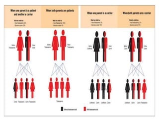 This document discusses thalassemia, a hereditary blood disorder caused by an imbalance in hemoglobin production. It describes the types of thalassemia, including alpha and beta thalassemia minor, intermedia, and major. For beta thalassemia major, regular blood transfusions are necessary to survive. Clinical manifestations include severe anemia, bone deformities, and organomegaly. Diagnosis involves blood tests and molecular analysis. Treatment depends on severity but may include frequent blood transfusions, iron chelation therapy, and bone marrow transplantation. Nursing care focuses on monitoring vital signs, managing transfusions and chelation therapy, and providing education to patients and families.