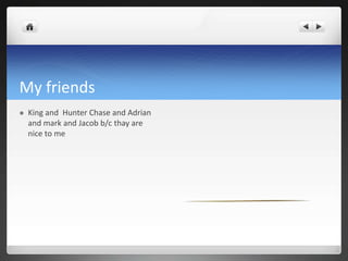 The document expresses gratitude for friends like King, Hunter, Chase, Adrian, Mark and Jacob for being nice. It is thankful that King helped by putting things in a backpack. It is also thankful for two dogs that make the author happy when sad, as well as being thankful for family.