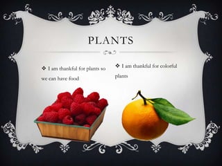 The document expresses gratitude for several things including plants that provide food, colorful plants, friends named Max and Hunter who care for the author, a pet that plays with the author and is always with them, a family that always cares for the author, and a mother who helps the author sit, breathe, and climb.
