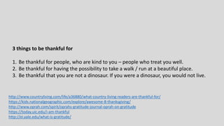 The document discusses the benefits of gratitude and thankfulness. Practicing gratitude has been shown to improve relationships, health, and well-being. It recommends expressing thanks for others through writing thank you notes or placing appreciation messages on place cards at meals. Regularly reflecting on things one is thankful for trains the brain to adopt a more positive mindset. Children who score high in gratitude have been found to have better social lives and academic performance.