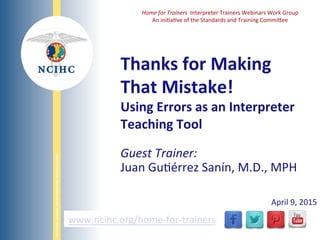 The document discusses a webinar by the National Council on Interpreting in Health Care, featuring guest trainer Juan Guérrrez Sanín, focusing on using errors as a teaching tool for interpreter training. It emphasizes the importance of accuracy in medical interpretation, the accountability of interpreters for errors, and provides strategies for training interpreters to recognize and avoid common mistakes. Key topics include understanding error types, the significance of clear communication, and the need for continual self-assessment by interpreters.