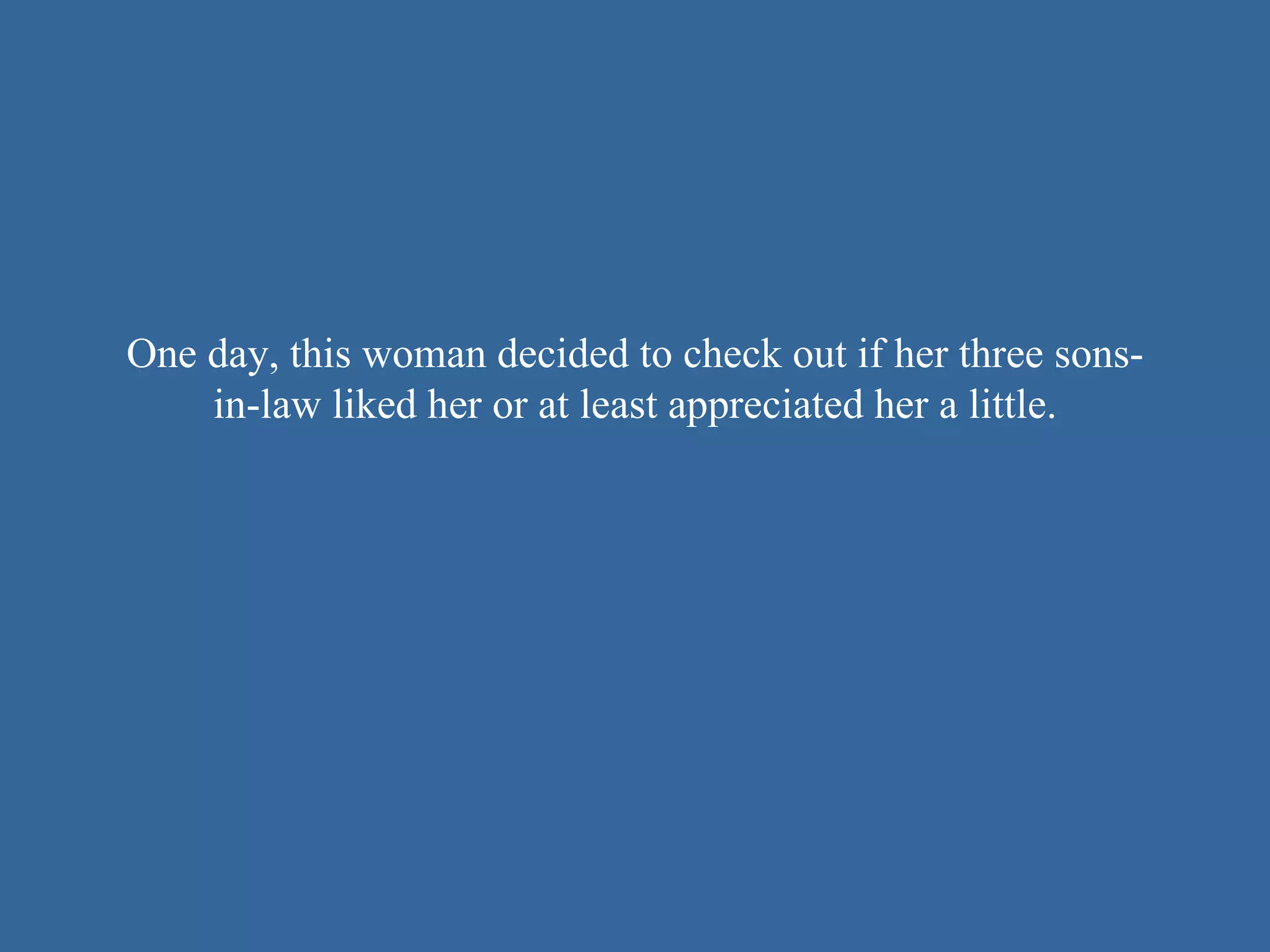 A mother-in-law pretended to drown in a river to test how much her three sons-in-law cared for her. The first two sons-in-law immediately jumped in and saved her, finding new cars in their driveways the next day with thankful notes. The third son-in-law did not help her, instead wishing for her death, finding a Porsche the next day with a note from his grateful father-in-law.