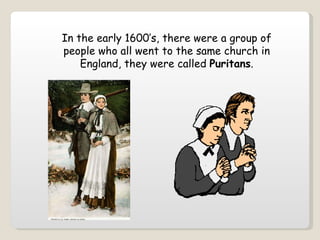 The passage describes the story of the first Thanksgiving celebrated by the Pilgrims and Wampanoag people. The Pilgrims fled religious persecution in England and traveled on the Mayflower to settle in America. Many Pilgrims died that first winter from sickness and starvation. The Wampanoag people taught the Pilgrims how to hunt, fish, and grow corn so they could survive. The following harvest, the Pilgrims and Wampanoag shared a feast to celebrate their first successful harvest and to give thanks for their new lives in America.