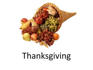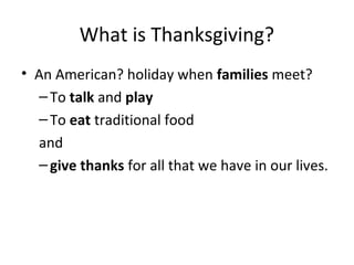 Thanksgiving is an American holiday celebrated in November where families get together to eat traditional foods like turkey and give thanks for what they have. The origins of the holiday come from Pilgrims who had a feast in 1621 with Native Americans to celebrate surviving their first year in America with the help of the Native Americans teaching them how to farm local foods. In 1863, President Lincoln declared Thanksgiving a national holiday to continue celebrating the Pilgrims. A typical Thanksgiving involves waking up, watching parades, cooking all day with family, eating a large meal together, playing games, watching TV specials, and getting ready for Christmas shopping the next day.