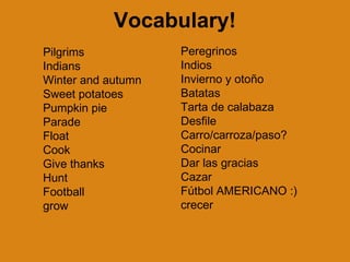 The document provides information about the Thanksgiving holiday in the United States. It discusses [1] the history of the Pilgrims and the origins of the holiday, [2] common Thanksgiving foods like turkey and pumpkin pie, and [3] popular activities like watching football and parades.