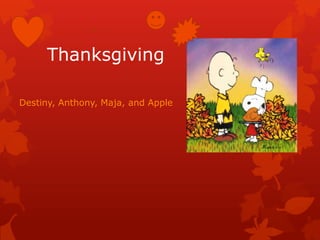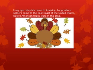The document discusses the origins of Thanksgiving in the United States. It notes that Native American tribes lived in the East Coast areas long before European colonists arrived on the Mayflower in 1621. The following year, the colonists held a harvest feast with the Native Americans that is considered the first Thanksgiving. Today, Americans celebrate Thanksgiving on the fourth Thursday of November, honoring that first feast which included foods like roast turkey, cranberry sauce, potatoes, and pumpkin pie.