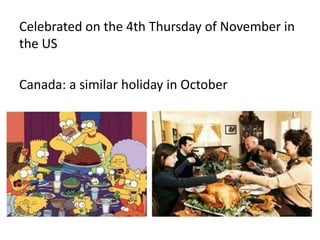 Thanksgiving is celebrated annually on the fourth Thursday of November in the United States and Canada. It originated as a harvest festival celebrated by Pilgrims and Native Americans in 1621. The traditional Thanksgiving meal features turkey, stuffing, mashed potatoes, cranberry sauce, and pumpkin pie. People gather with family and friends over a potluck meal to give thanks for blessings received throughout the year.