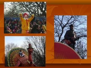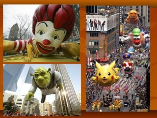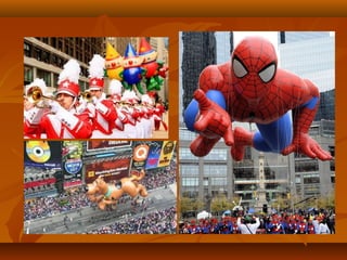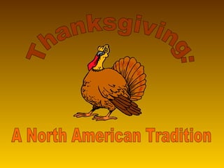 Thanksgiving is a North American holiday celebrated in late November that originated from the English Pilgrims' harvest feast in 1621. It is traditionally celebrated with a large meal including turkey, stuffing, potatoes, vegetables, cranberry sauce, and pumpkin pie. Families gather to give thanks for health, prosperity, friendship, and loved ones. Common traditions include watching the Macy's Thanksgiving Day Parade in New York City and sharing what each family member is grateful for before eating.