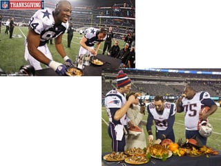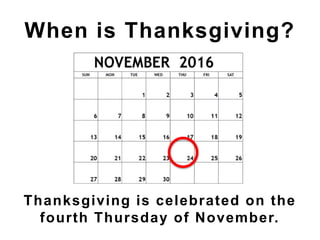 Thanksgiving is celebrated annually on the fourth Thursday of November in the United States. It commemorates the 1621 harvest feast shared by the Pilgrims and Wampanoag people after experiencing a difficult first winter in Plymouth. The Pilgrims had fled religious persecution in England and sought freedom and prosperity in the New World. The three-day celebration involving the Pilgrims and Native Americans included activities like games and a feast featuring foods such as turkey, pumpkin, and squash. Abraham Lincoln declared Thanksgiving a national holiday in 1863.