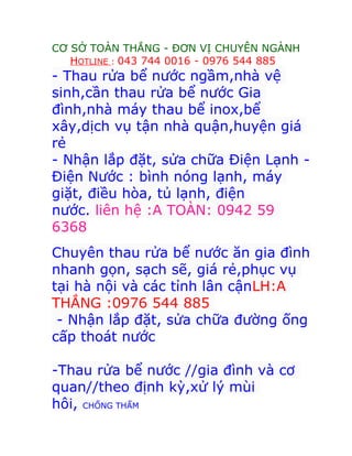 Công ty chuyên cung cấp dịch vụ thau rửa bể nước, sửa chữa điện nước và lắp đặt thiết bị vệ sinh tại Hà Nội và các tỉnh lân cận, với giá cả phải chăng. Các dịch vụ bao gồm xử lý tắc nghẽn, chống thấm, và sửa chữa đường ống cấp thoát nước. Công ty sử dụng công nghệ hiện đại và phục vụ nhanh chóng, tận nhà cho khách hàng.