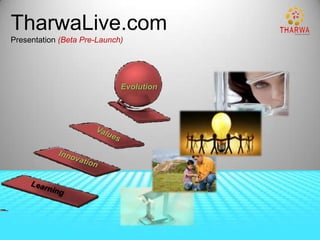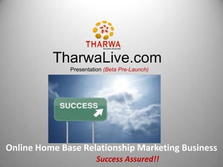 The document presents an online home base relationship marketing business called TharwaLive that provides health and wellness products through a direct sales model. It outlines TharwaLive's founding, past success distributing over $150,000, and compensation plan that can generate hundreds of thousands in monthly income. Becoming an active associate for $50 allows one to join TharwaLive's business opportunity and work towards financial freedom and one's goals.