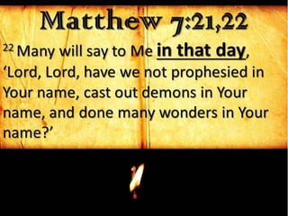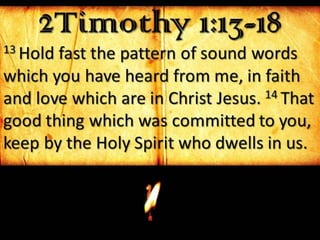 The document discusses passages from 2 Timothy and other scriptures, focusing on the concept of 'that day,' which refers to a time of judgment and the granting of mercy for faithful servants. It emphasizes the importance of holding onto sound teachings, the necessity of God's mercy, and reflects on the attitudes Paul had towards suffering and faith. Overall, it highlights the themes of accountability, grace, and perseverance in faith.
