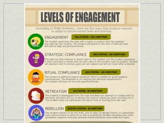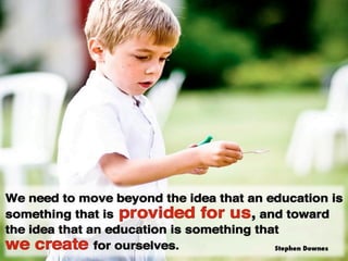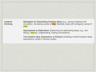 The document discusses the topic of innovation in education. It explores what innovation means, where it is seen, and how it can be encouraged. Some key points made include that innovation involves introducing new methods and ideas to change the status quo. Innovation is seen in examples from individual teachers experimenting with new approaches. It also notes that play, questioning, collaboration and allowing failure can help encourage innovation. Challenges discussed include innovation feeling lonely and increasing divides in approaches within education.