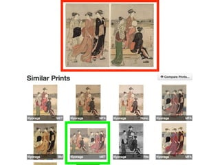 This document discusses how computer vision techniques can be applied to art history. It provides an overview of different computer vision approaches such as optical character recognition (OCR), face recognition, and image similarity/categorization. Unsupervised techniques like OCR and image similarity require little labeling of data but may not provide as interesting results. Supervised techniques can more precisely locate parts of images or categorize images but require large labeled datasets. The document recommends several free and open-source computer vision libraries and tools that can be used to explore applying these techniques to art history, along with some caveats about training data requirements.