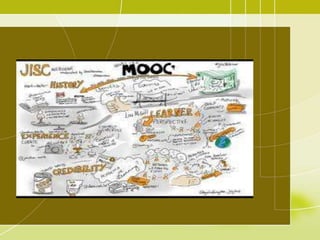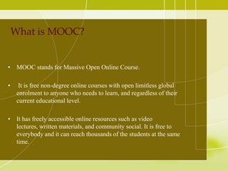 Massive Open Online Courses (MOOCs) provide free online courses to unlimited participants worldwide. The first MOOC launched in 2008. Major MOOC platforms like Coursera and edX emerged in 2012 and enabled more than 100,000 students to enroll in individual courses. MOOCs can be cMOOCs focusing on connectivist pedagogy through learner interactions or xMOOCs using an instructivist approach with video lectures. The author is interested in using MOOCs to learn financial mathematics, trigonometry, and geometry which they believe will help learners better understand traditionally difficult topics.