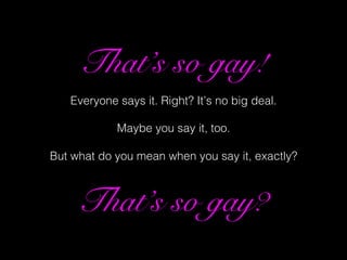 The document questions the common use of the word "gay" to mean something is dumb or stupid. It lists many famous historical figures from Alan Turing to Michael Sam who were gay and accomplished great things, implying that calling something "gay" is derogatory towards the LGBTQ community. It encourages using more precise language to avoid unintended offense.