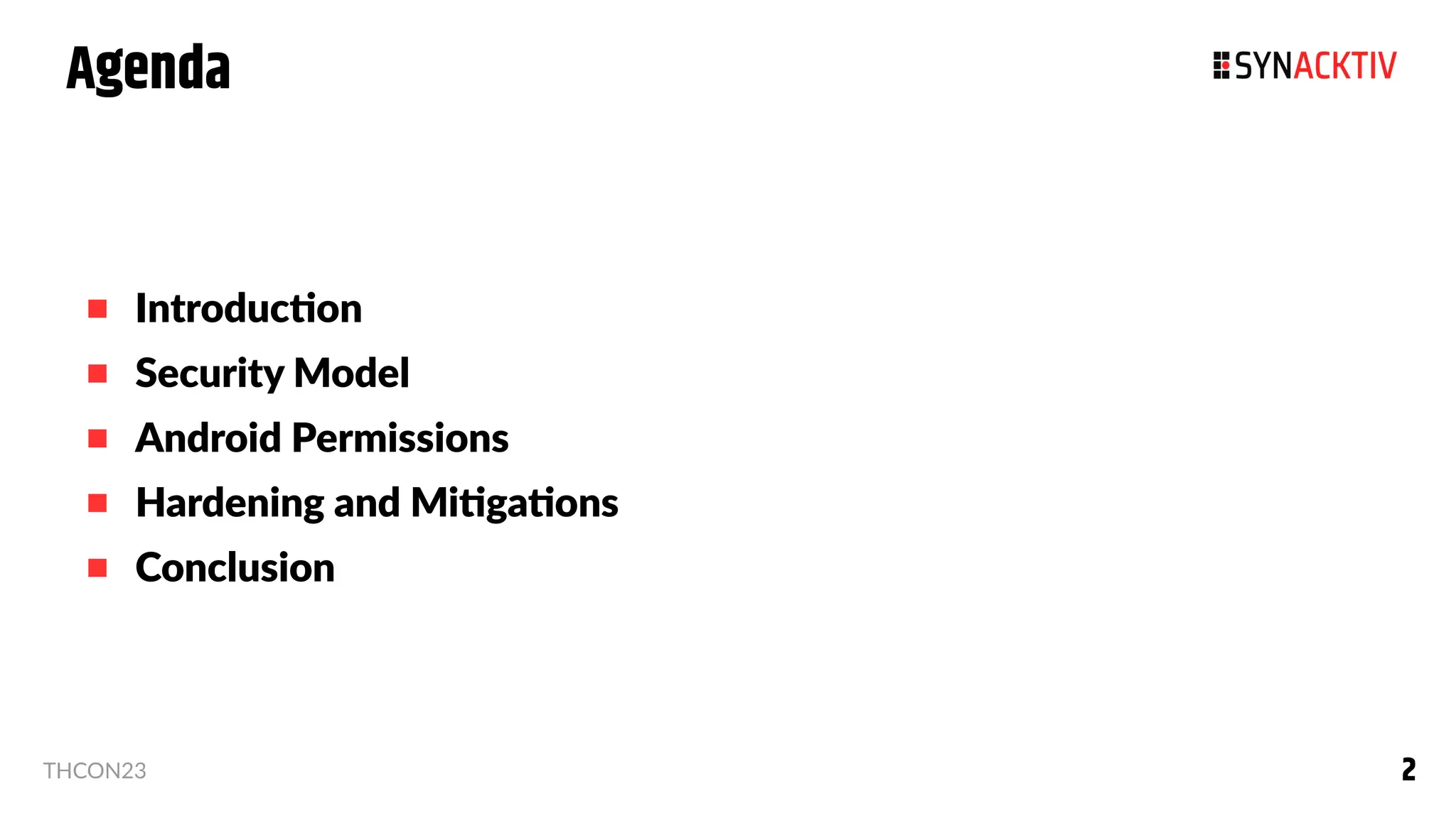 The document summarizes the Android security model. It describes how Android isolates applications using Linux users and groups, SELinux, and SECCOMP filtering to restrict syscalls. It also discusses how permissions are used to control interactions between applications and access to sensors and data. The security model is strengthened over time with measures like ASLR, CFI, and compiler sanitizers to mitigate vulnerabilities.