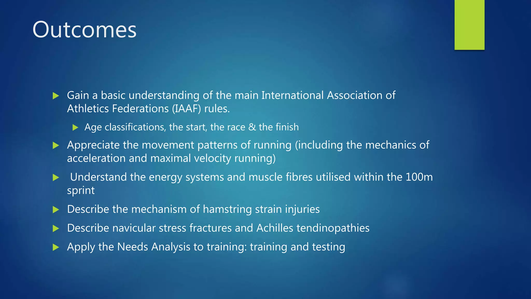 The document provides an in-depth needs analysis for the 100 metre sprint, covering key topics such as international athletics rules, movement patterns, energy systems, and injury mechanisms. It outlines training and testing approaches for sprinters, emphasizing strength, power, and optimal running mechanics to improve performance. Additionally, it discusses the physiological demands of sprinting and analyzes common injuries encountered in the sport.