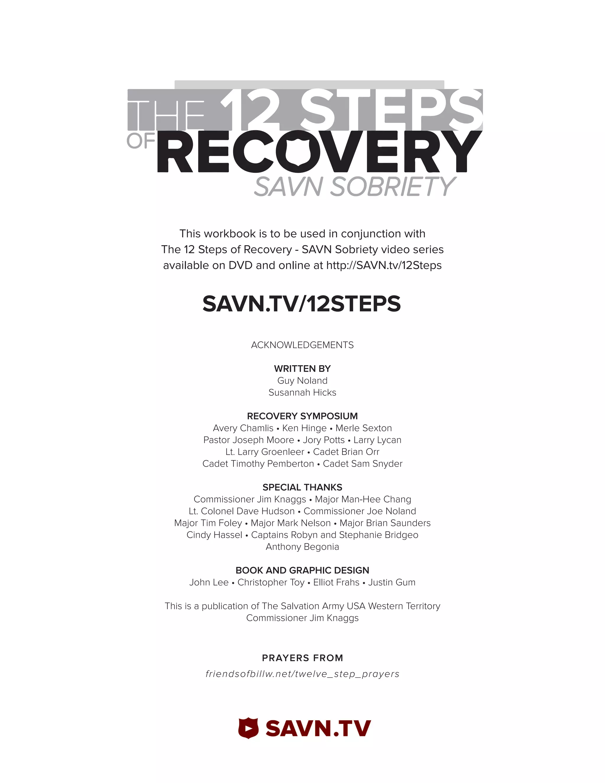 This workbook is designed to accompany the 12 Steps of Recovery video series, focusing on personal reflections and admissions related to addiction and recovery. It includes assessments and exercises encouraging individuals to recognize the impact of their behaviors and the necessity of acknowledging a higher power in their journey towards sobriety. Acknowledgements are provided for contributors and key figures involved in its creation.