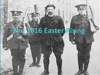 The document discusses the difficult choices faced by Irish nationalists during World War I, primarily whether to fight for Britain or assert their own independence. Key figures like John Redmond advocated for joining the British army, while others, including Patrick Pearse and James Connolly, pushed for resistance, culminating in the Easter Rising of 1916, which ultimately ended in military failure but sparked increased sympathy for the rebels. The aftermath involved the execution of rebel leaders by the British, which backfired and fueled further rebellion efforts led by figures such as Eamon Devalera and Michael Collins.