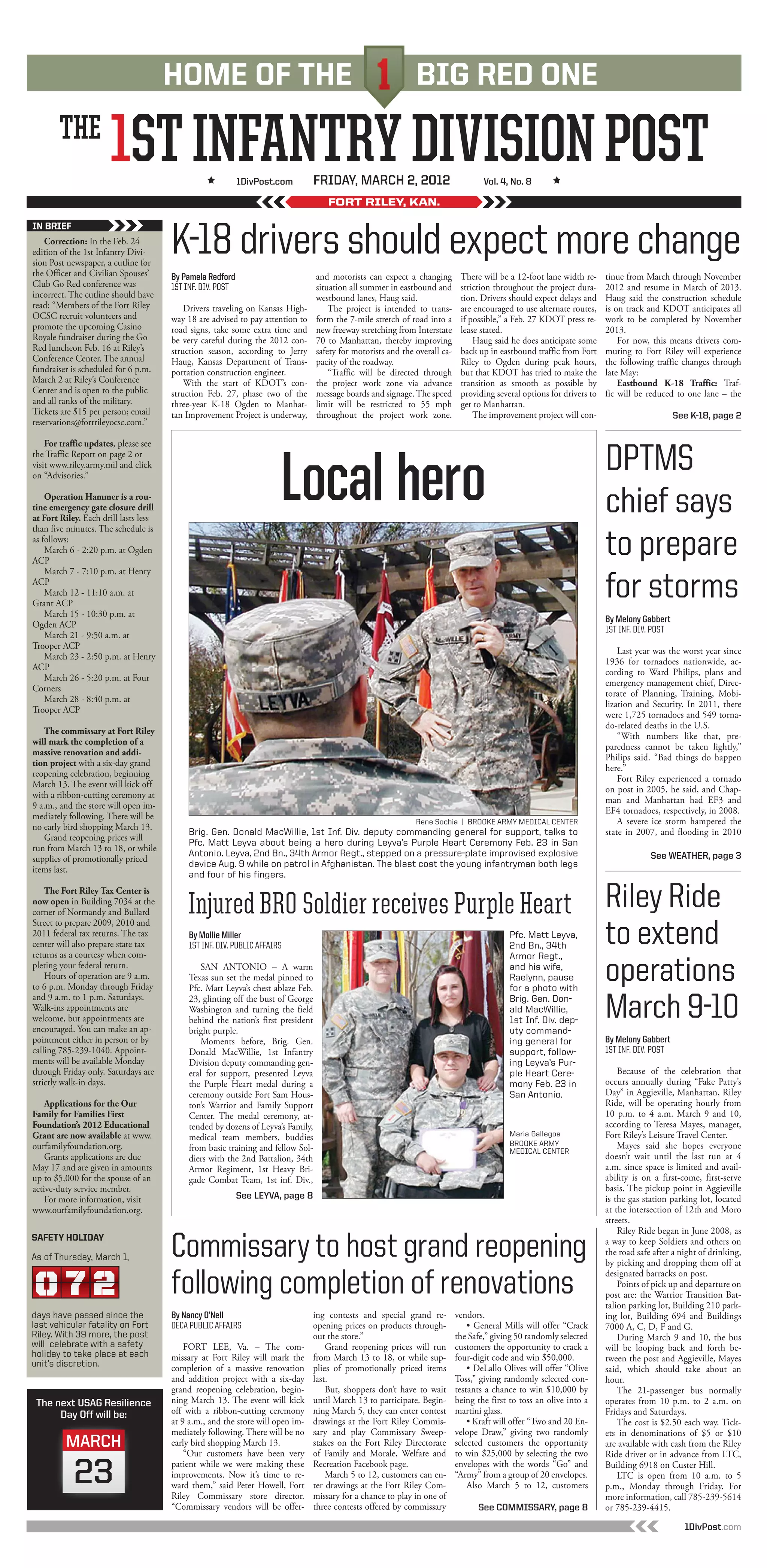 The document provides information about upcoming construction on Kansas Highway 18 that will impact drivers traveling between Manhattan and Fort Riley from March 2012 through November 2013. The multi-phase project will reduce traffic to one lane in each direction and restrict speeds to 55 mph through the construction zone. Drivers are advised to expect delays and use alternate routes if possible. The 12th Street gate at Fort Riley will also be utilized more to reduce congestion on K-18 during construction.