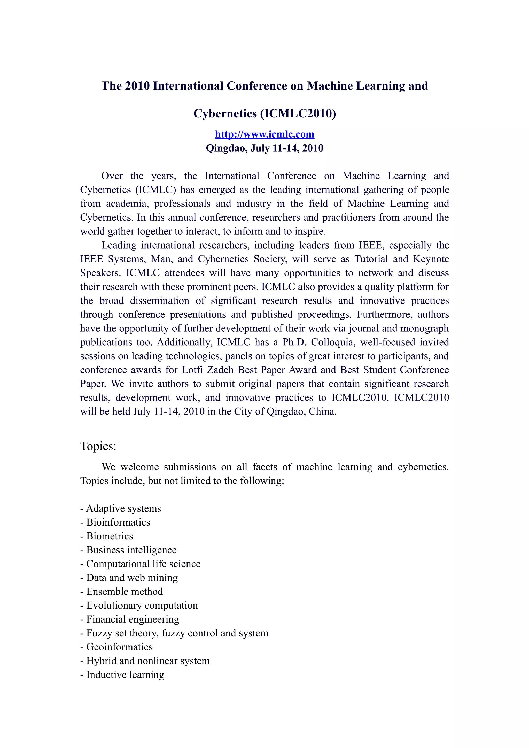 The 2010 International Conference on Machine Learning and Cybernetics (ICMLC2010) will be held from July 11-14, 2010 in Qingdao, China. Over the years, ICMLC has emerged as a leading international conference that brings together academics, professionals, and industry researchers in the fields of machine learning and cybernetics. Authors are invited to submit original research papers by March 1, 2010 for peer review and potential presentation at the conference.
