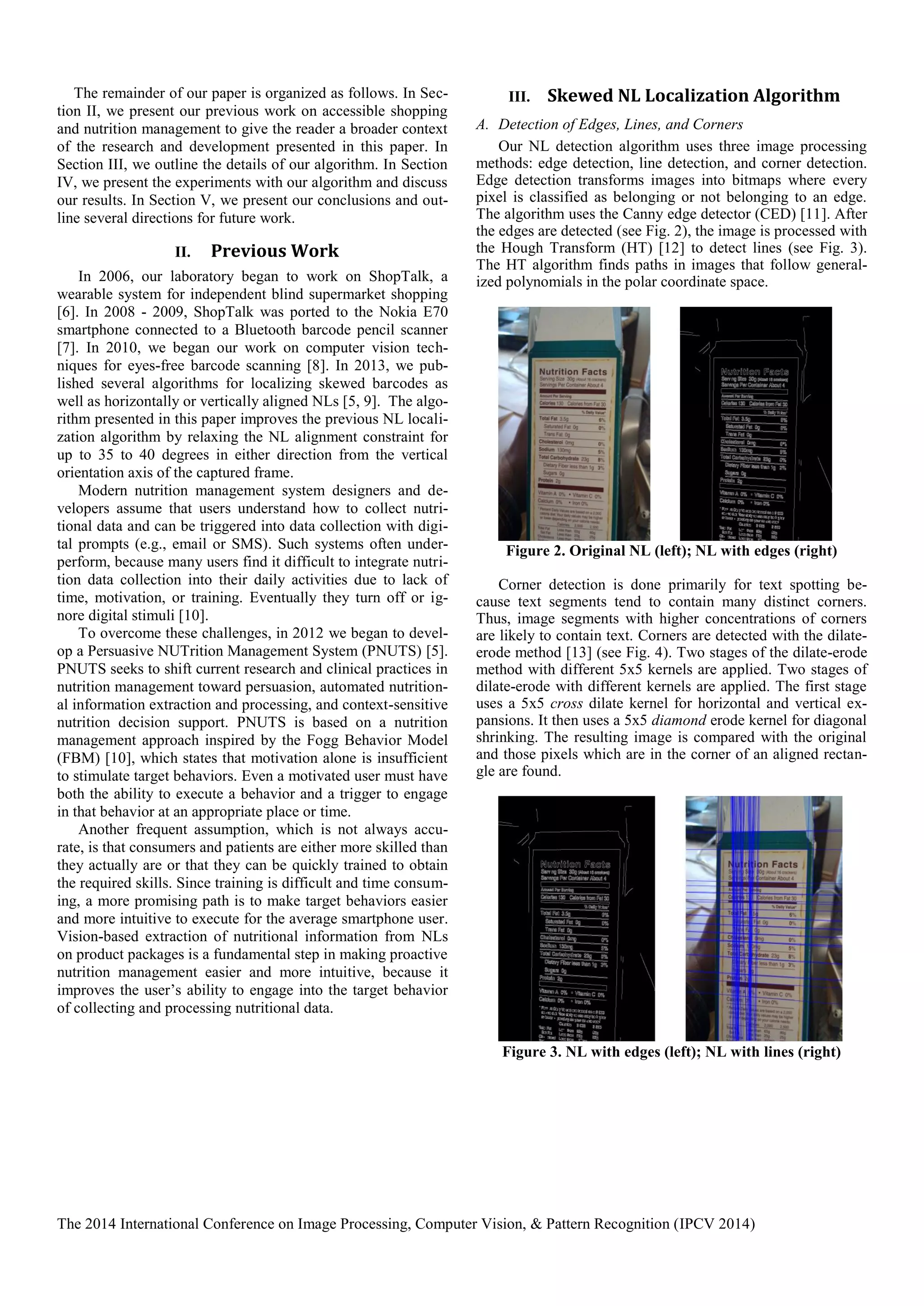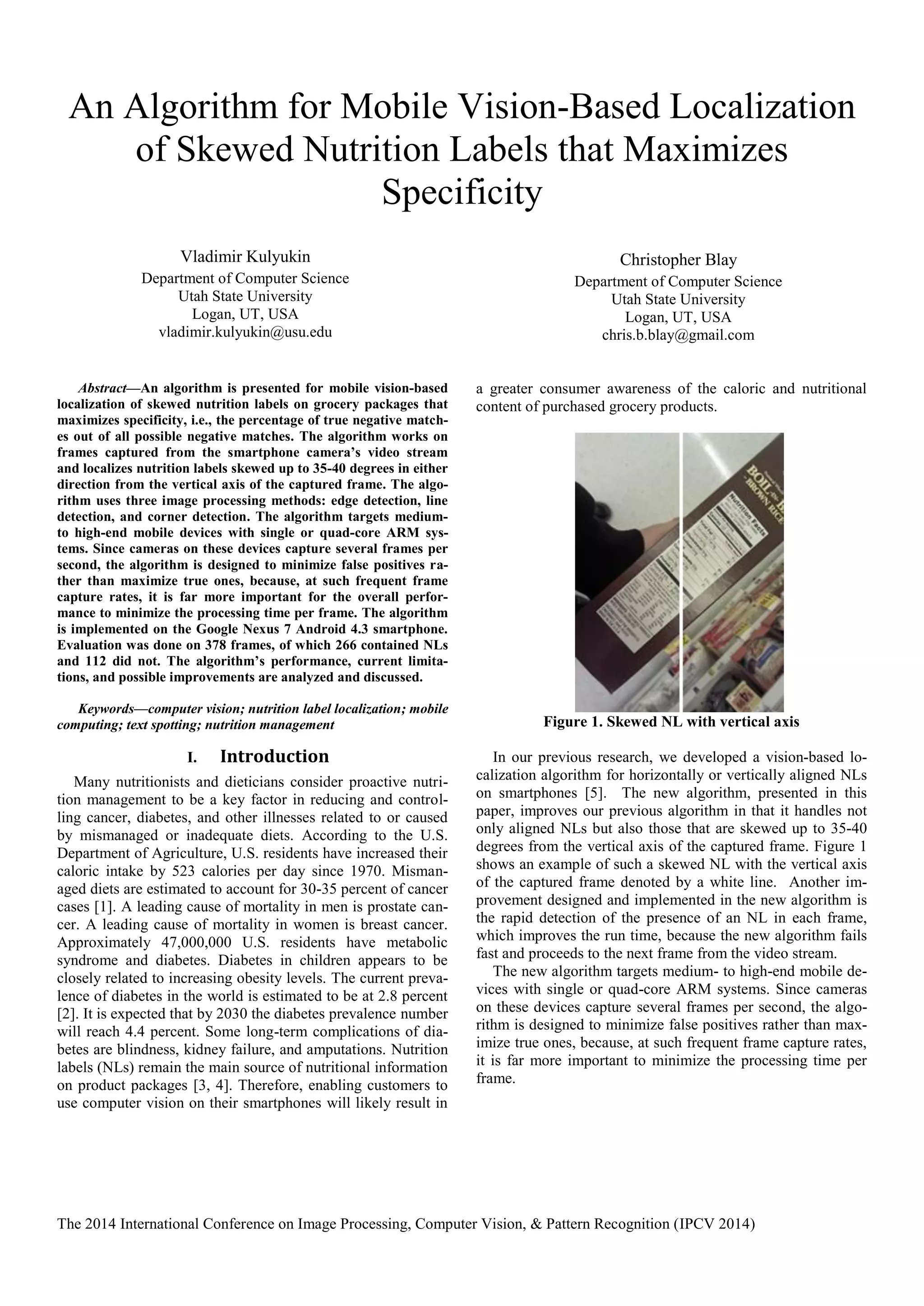 This document presents a new algorithm for mobile vision-based localization of skewed nutrition labels on grocery packages, achieving high specificity by minimizing false positives. The algorithm employs edge, line, and corner detection methods, accommodating labels skewed by up to 40 degrees from vertical, and is implemented on a Google Nexus 7 smartphone. Performance evaluation on a dataset of 378 images shows a true positive rate of 42% and emphasizes the importance of rapid processing to enhance user engagement in nutrition management.
