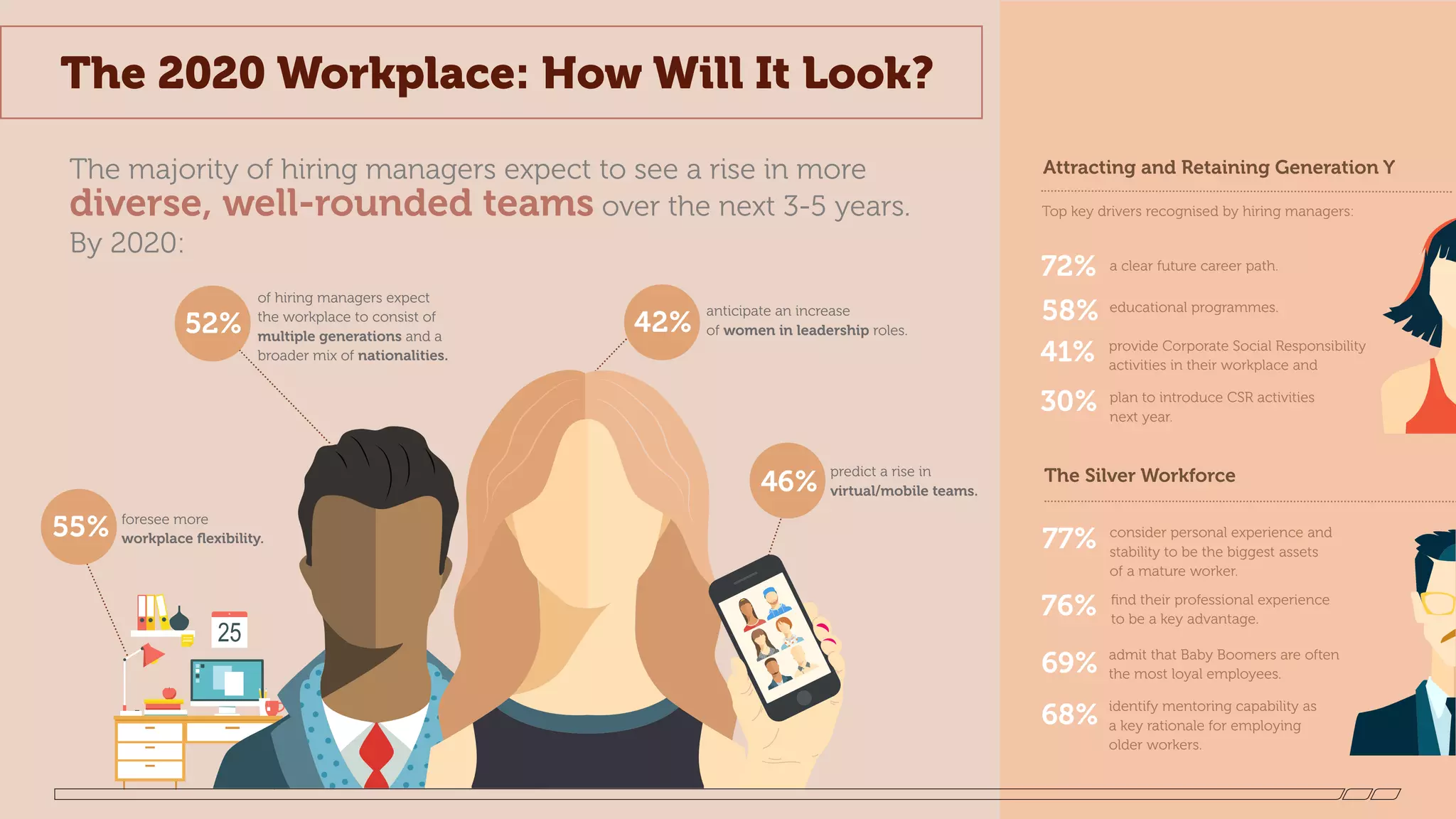 - 52% of managers expect to see more diverse, multigenerational teams consisting of multiple nationalities by 2020. 55% also foresee more workplace flexibility with options like schedule flexibility and virtual/mobile teams.