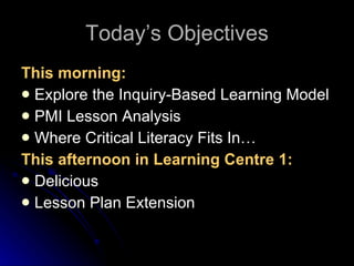 The document discusses the inquiry-based learning model and critical literacy. It explores how inquiry-based teaching uses deep questioning to engage students with big ideas and lessons. Critical literacy focuses on examining perspectives, assumptions and voices in texts. It encourages students to question texts and consider how power and point of view shape meaning. The document argues that critical literacy benefits students by developing critical thinking, voice, and a sense of agency to enact social change.