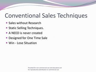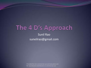The document describes the 4 D's Approach to sales, which includes Discover, Diagnose, Design, and Deliver phases. The Discover phase involves researching customers to find the best prospects. Diagnose ensures customers understand problems and gaps, creating need. Design develops optimal solutions collaboratively. Deliver builds credibility by formally proposing the solution to maximize customer value and maintain long-term relationships. The 4 D's Approach aims to create need, ensure customer delight, and achieve repeat business through a consultative process.