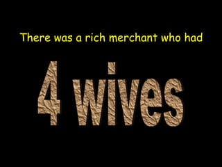 The merchant had four wives that he loved to varying degrees. When he fell ill and was dying, he asked each wife to keep him company after death. The fourth wife, whom he loved most, refused. The third wife said she would remarry. The second wife said she could only send him to the grave. His first wife, whom he neglected, promised to follow him no matter where he went. The merchant realized he should have taken better care of his mind, represented by the first wife, rather than focusing on fleeting possessions and pleasures.