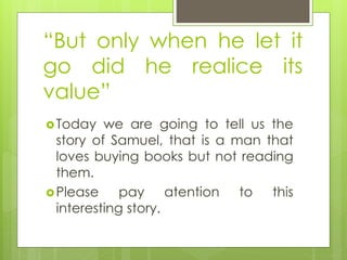 Samuel is a man who loves collecting books but does not read them. He has amassed a large collection of books that he has purchased but never read. One day he decides to get rid of some books and realizes the value of the books he is letting go after he has already parted with them.