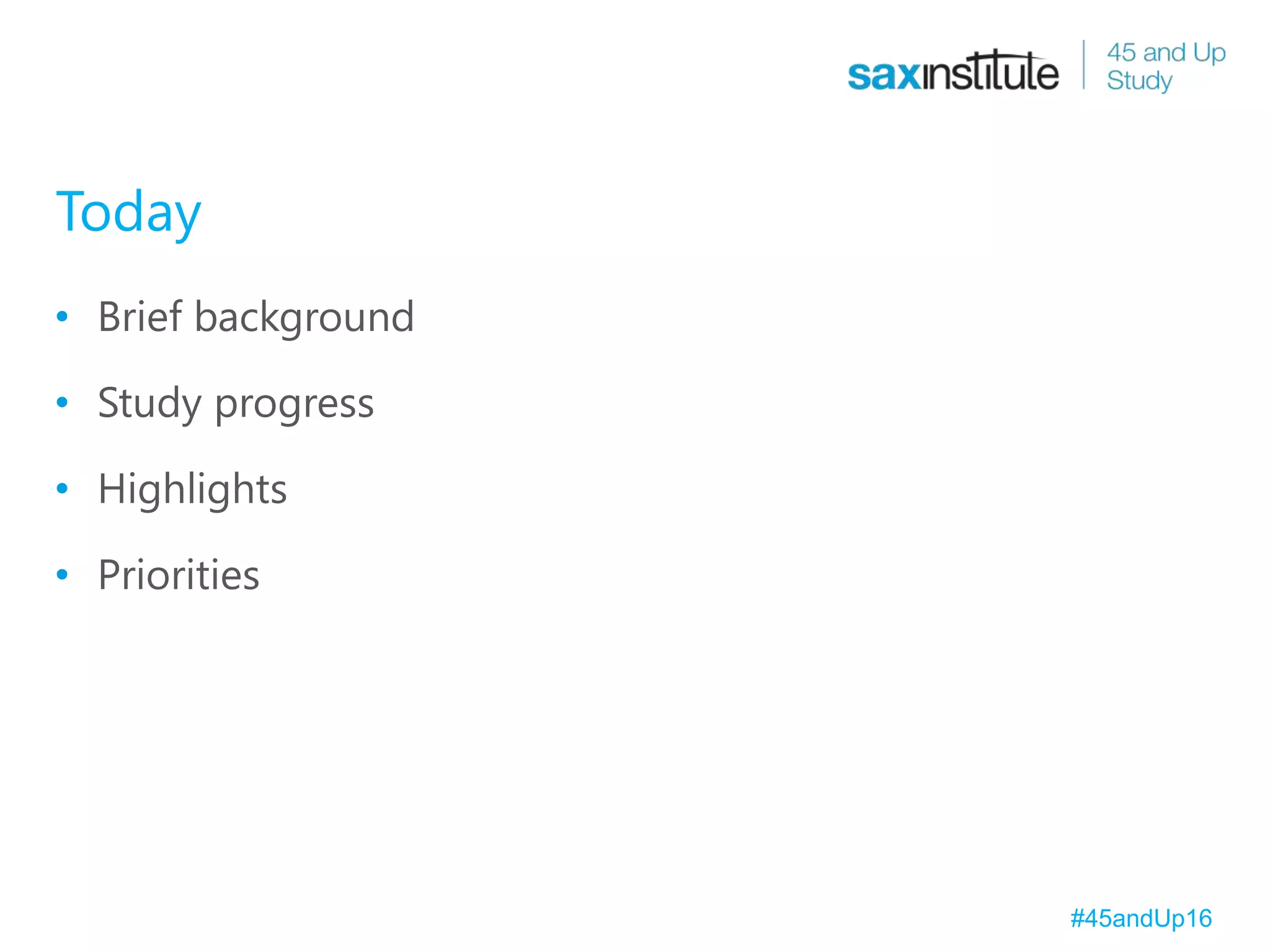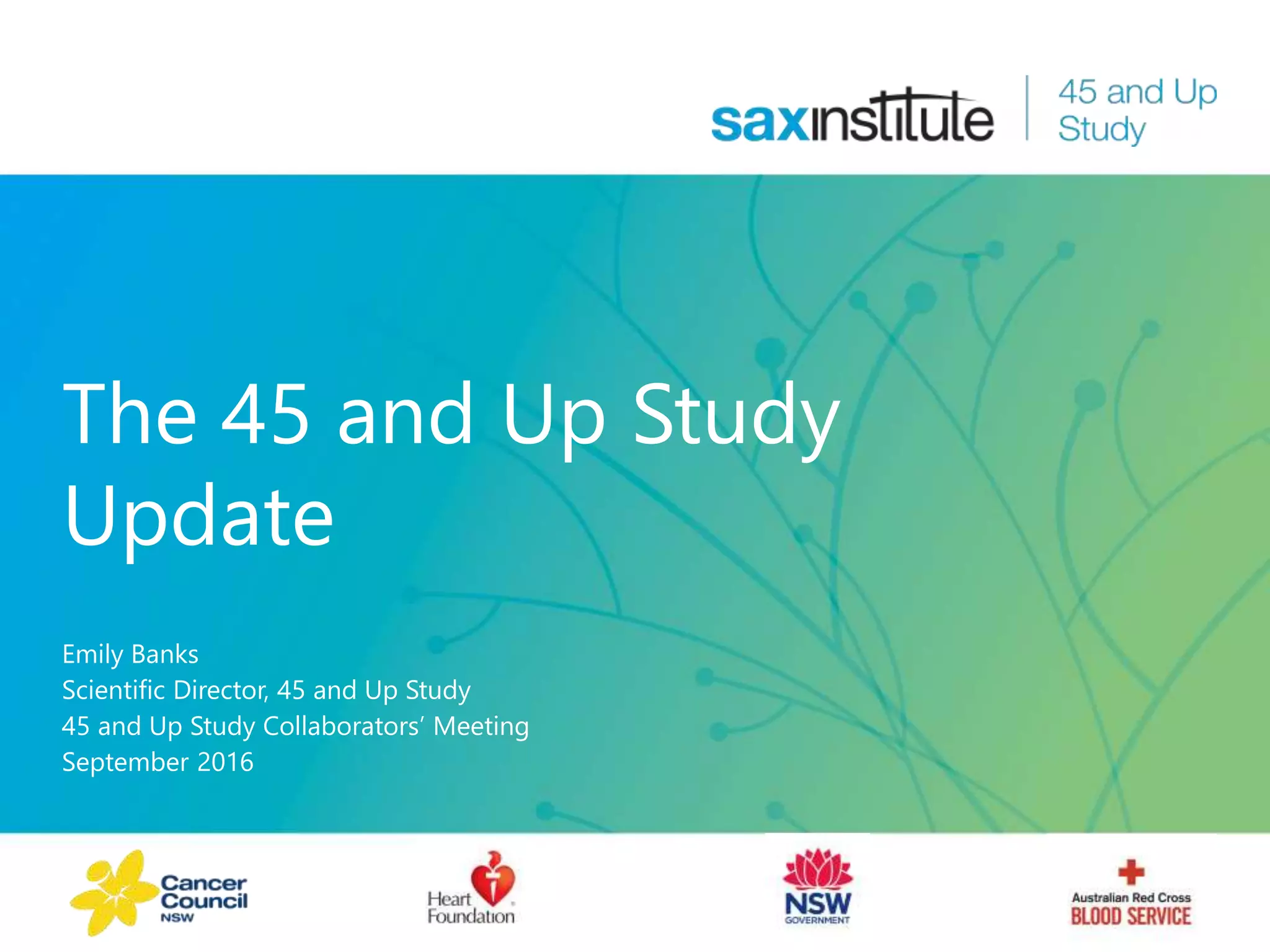 The 45 and Up Study is the largest long-term study of aging in Australia that has recruited over 267,000 participants aged 45 and older. It collects detailed health and lifestyle data through questionnaires and links this information to participants' medical records. Over the past decade, the study has grown substantially in its number of collaborative projects, publications, and external funding. Key priorities now include facilitating new data linkages, utilizing genomic data, replenishing the cohort, and reviewing coordination of the study.