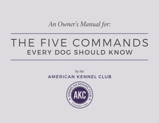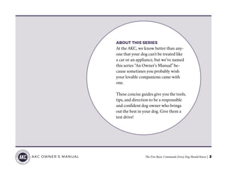 The document is an owner's manual by the American Kennel Club outlining the five essential commands every dog should learn: come, heel, sit, stay, and down. It provides tips for positive reinforcement during training and emphasizes the importance of making training sessions fun and engaging for the dog. Additionally, the AKC highlights its role in promoting responsible pet ownership and supporting various initiatives for both purebreds and mixed-breeds.