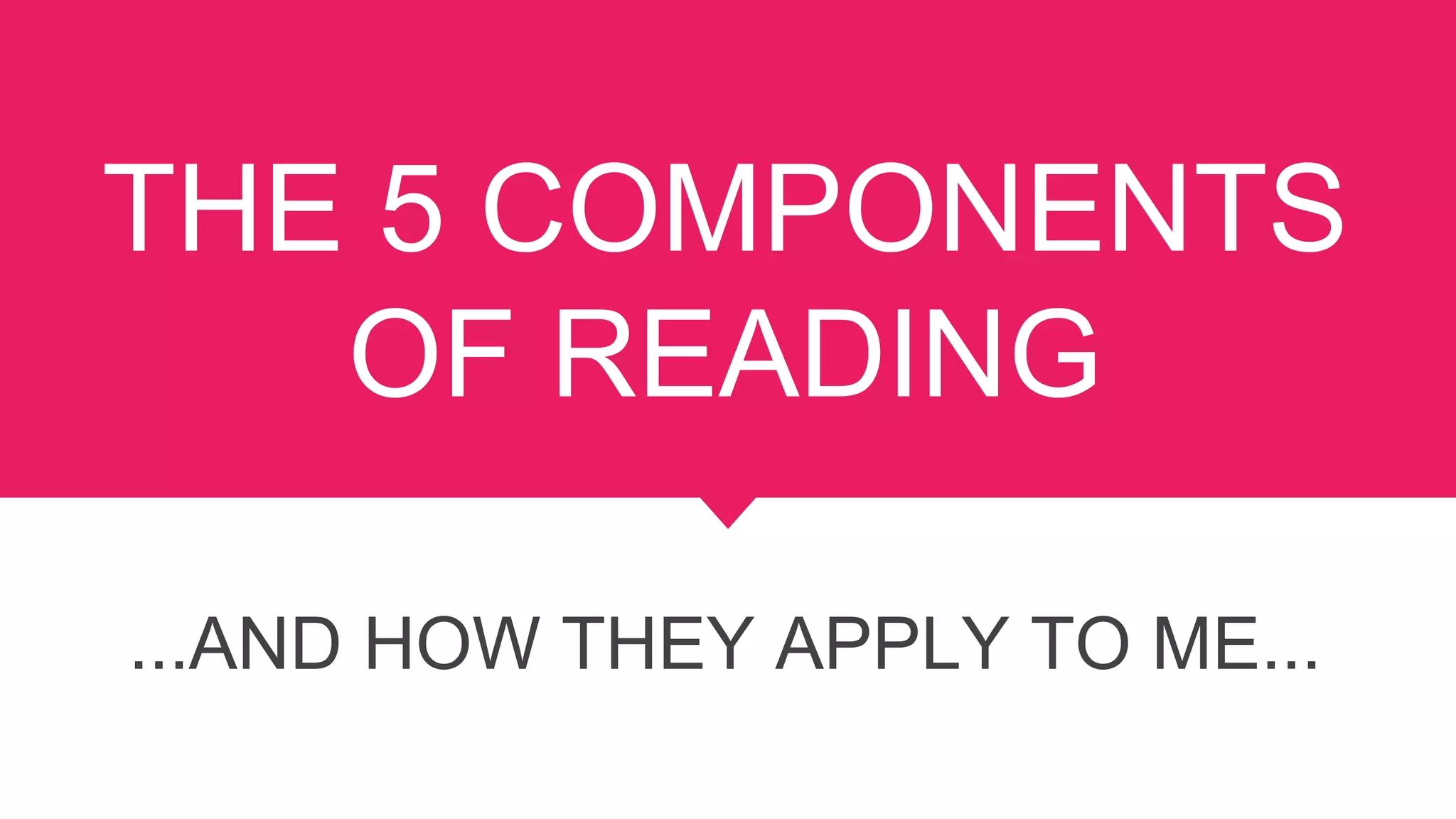 This document introduces the 5 components of reading: phonemic awareness, phonics, fluency, vocabulary, and comprehension. It discusses dividing into groups to learn about each component, what each component is, and how to teach it. Phonemic awareness is the ability to hear, identify, and manipulate individual sounds in words. Phonics teaches the relationship between letters and sounds. Fluency is reading accurately and quickly. Vocabulary is the words needed to communicate. Comprehension is the reason for reading and is taught through strategies and text interaction. The goal is to increase background on these components and apply them to teaching.
