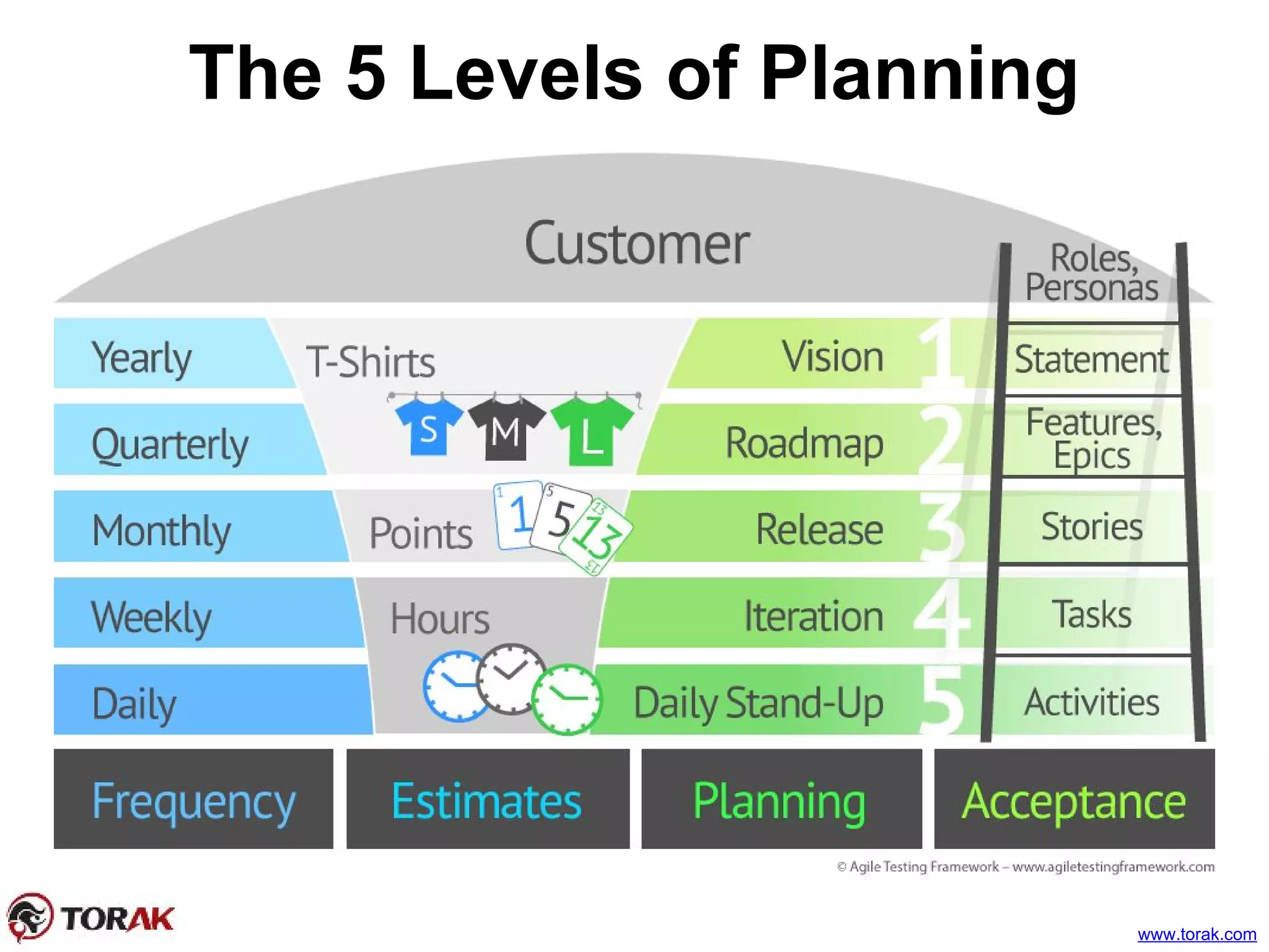 The document outlines the five levels of planning within an agile framework, detailing the roles of vision, roadmap, release planning, iteration planning, and daily stand-ups in project management. Dimitri Ponomareff, a certified coach and facilitator, emphasizes the importance of communication and collaboration in building effective teams and driving continuous improvement. It also includes Agile Manifesto principles and various tools and practices for effective planning and estimation in agile development.
