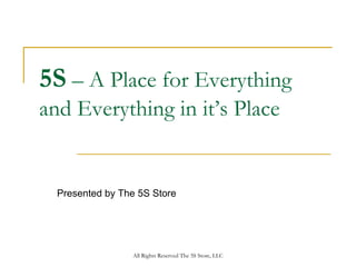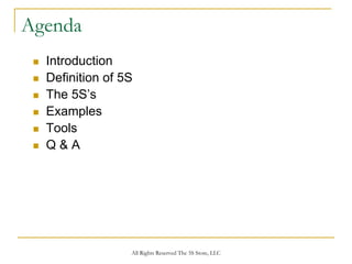 This document provides an overview of 5S, which is a system designed to ensure workplace safety, efficiency, cleanliness and quality. It describes the five S's of 5S: Sort, Set In Order, Shine, Standardize, and Sustain. Examples are given of how to implement each S through activities like red tagging unneeded items, creating shadow boards and labels, cleaning, and establishing routines to maintain the 5S system. Benefits include reduced wasted time and steps, improved safety, equipment reliability, and morale. Tools and contact information are also listed.