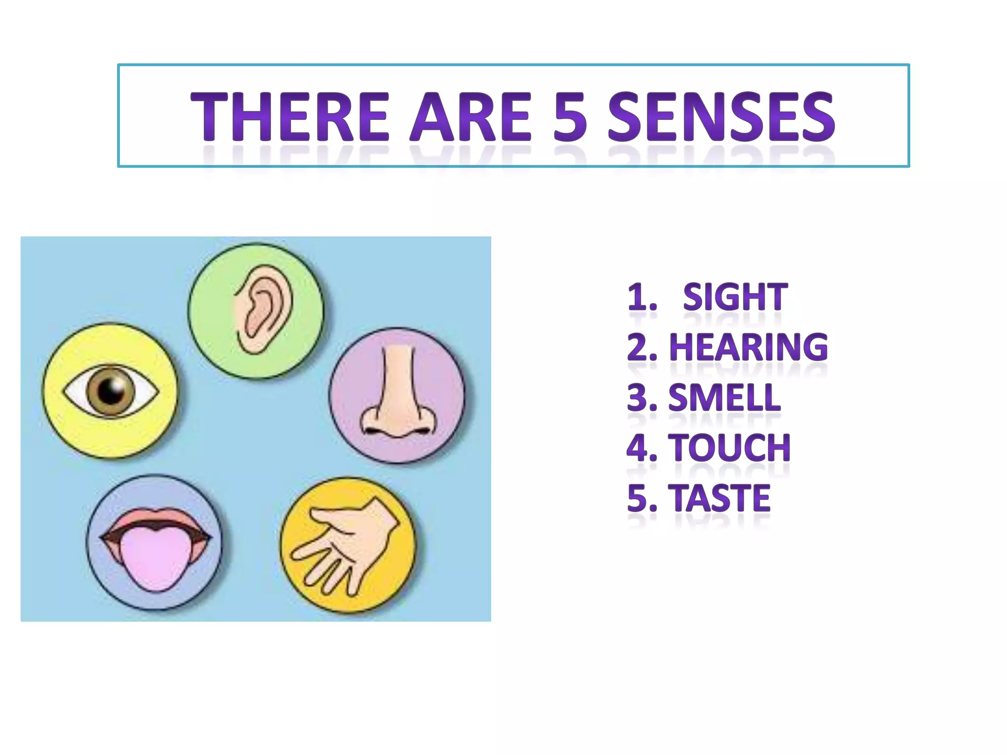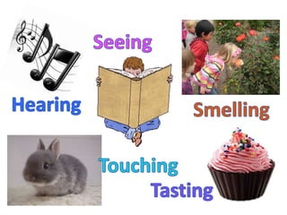The document discusses the human senses of sight, hearing, taste, touch, and smell. It explains that sight involves both the eyes and brain working together to process visual images. The eyes capture images that are sent to the brain as messages to be interpreted. Hearing involves sound waves vibrating the eardrum and small bones of the middle ear, generating signals in the inner ear that are transmitted by nerves to the brain. Taste buds detect different flavors through receptors on the tongue. Touch receptors in the skin send signals to the brain about textures, temperatures, and sensations. Smell works through odor molecules activating nerve endings in the nose.
