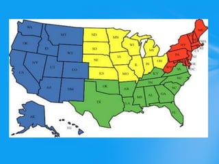 This document provides information about the 50 United States organized into four regions - Northeastern, Southern, Midwestern, and Western states. It lists the states in each region and provides a brief overview of Michigan, highlighting that it is the only state that touches four of the five Great Lakes and has two peninsulas. Resources with more details on each region and pictures are also included.