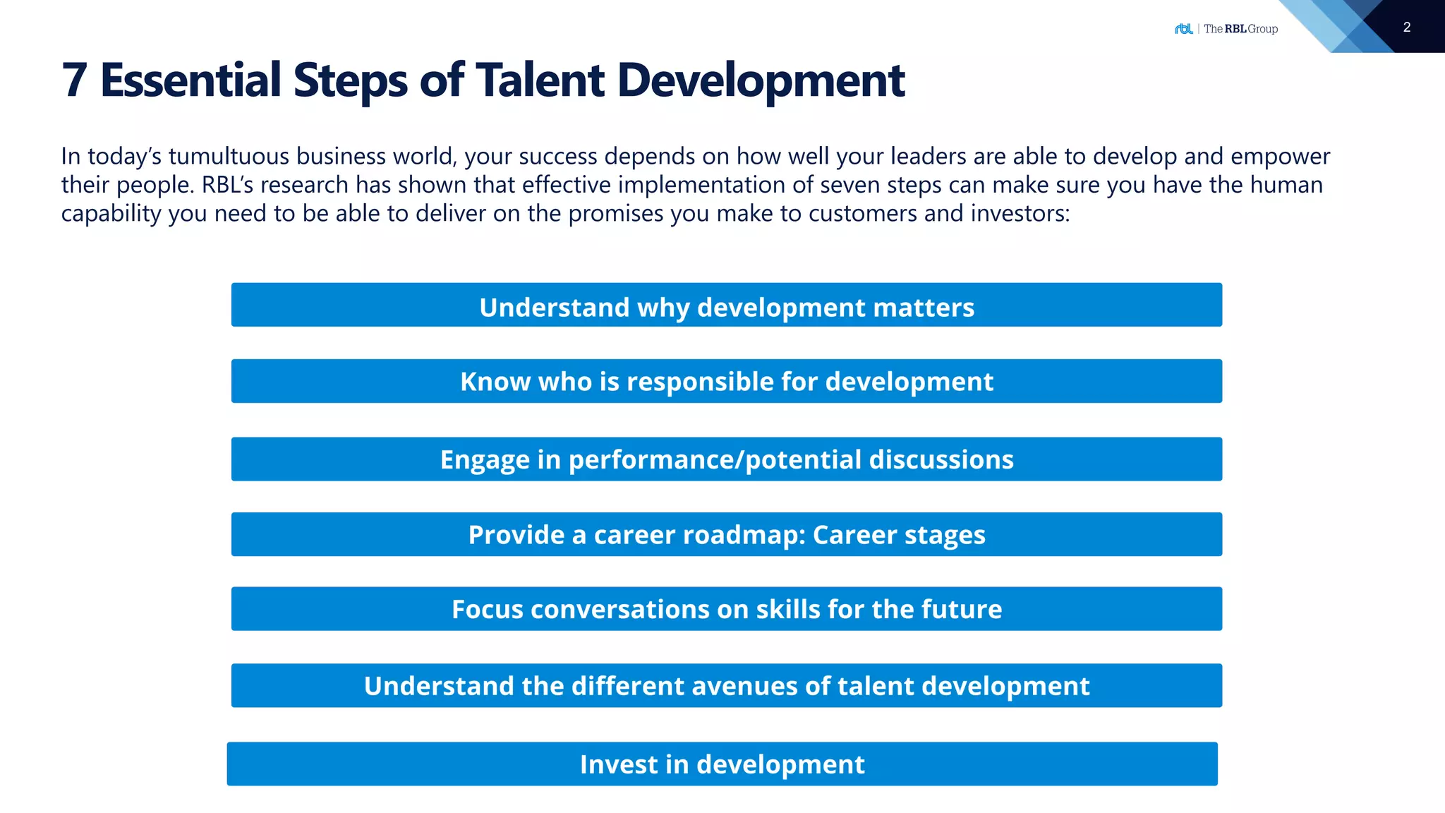 2. Define responsibilities for development - line managers are responsible for building talent on their teams, HR designs learning solutions, and employees own their growth.