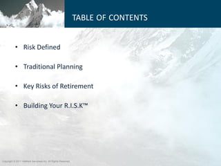 The document discusses risks in retirement planning. It defines risk as the potential for injury or loss. Traditional planning focuses on asset allocation during accumulation, but the goal is to transition savings into lifelong income during retirement. The key risks in retirement include market risk, longevity risk, inflation risk, health expenses, and lack of guaranteed income streams. The document advocates building a "retirement income survival kit" to address these risks.