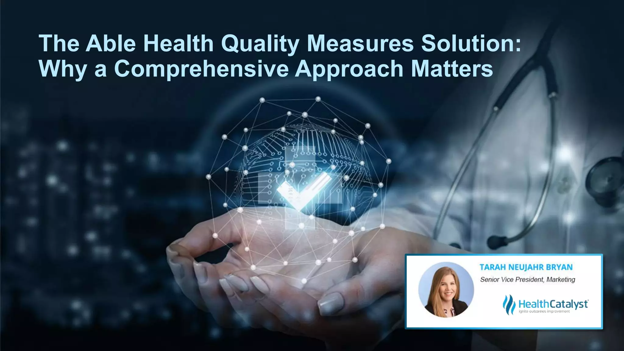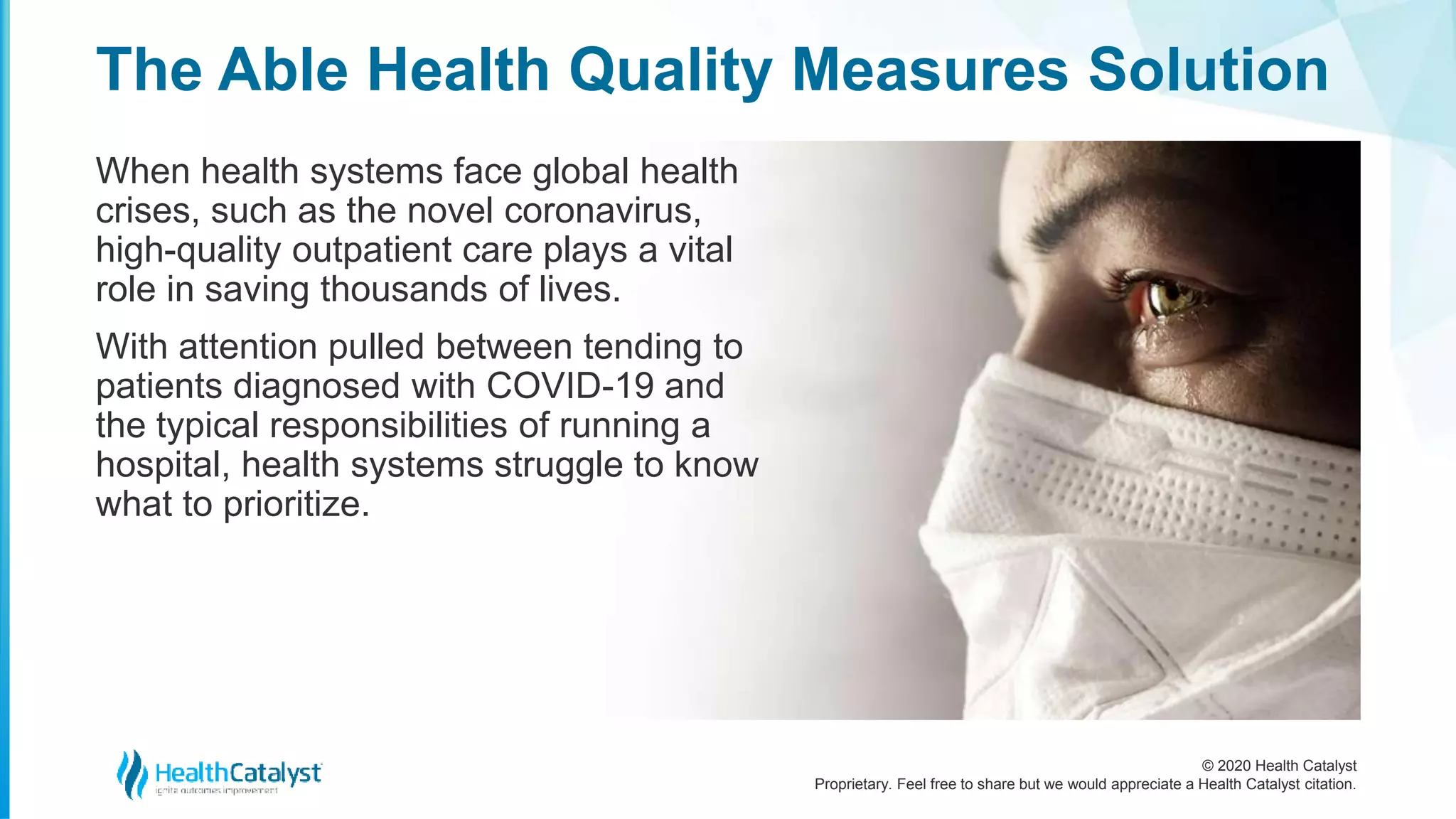 The Able Health Quality Measures Solution by Health Catalyst emphasizes the importance of high-quality outpatient care, especially during global health crises like the COVID-19 pandemic. It provides a comprehensive approach by offering a complete picture of quality performance through an integrated data system, allowing healthcare leaders to identify improvement opportunities and streamline quality measurement processes. This solution aims to reduce the burden of quality measurement on providers while improving overall healthcare quality.