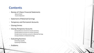 2. Making closing entries to reset temporary accounts to zero at the end of the period. This involves transferring account balances to income summary and then to retained earnings.