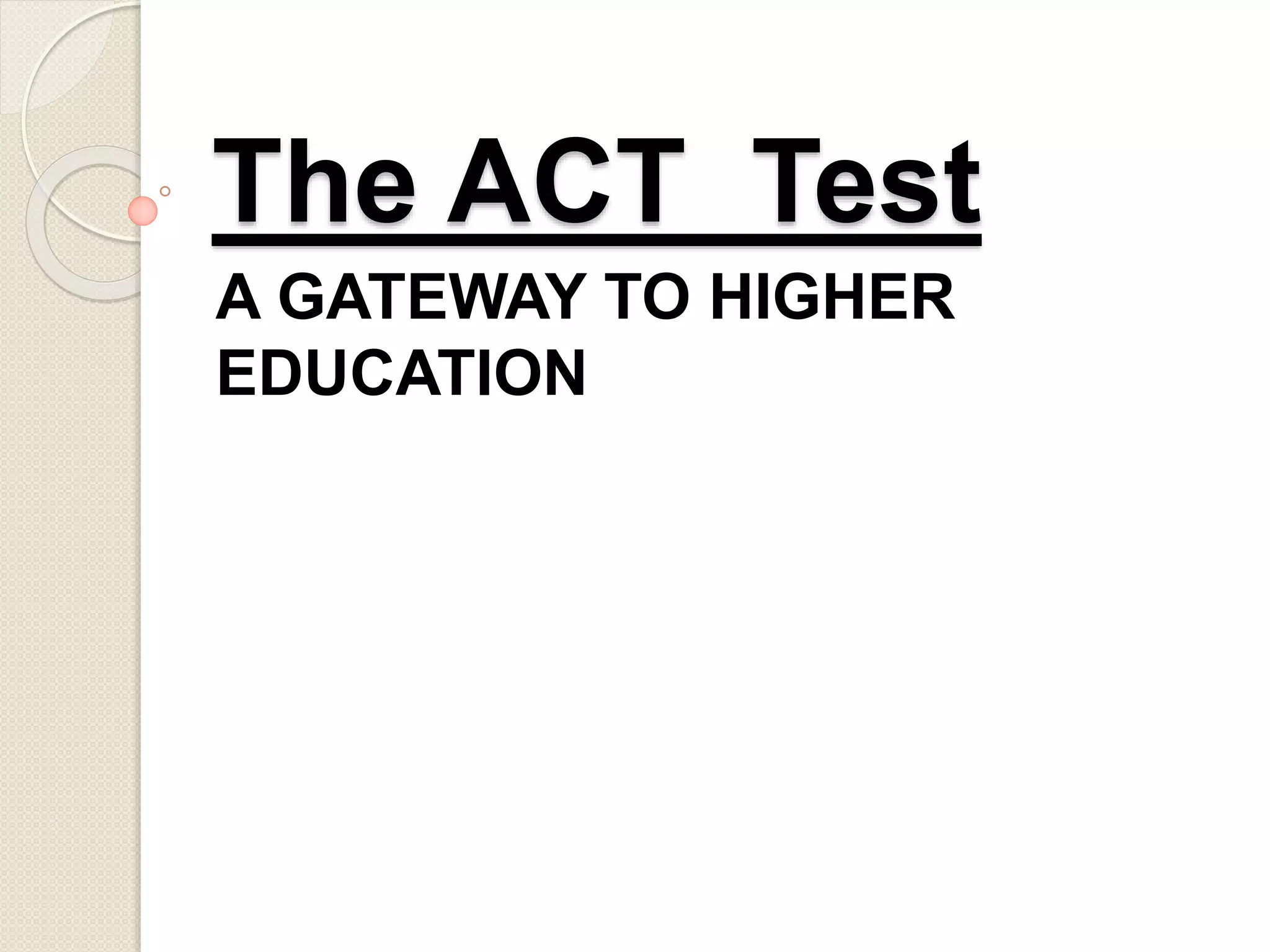 The ACT is a national college admissions exam accepted by all colleges and universities that consists of tests in English, reading, math, and science. It takes approximately four hours to complete and includes multiple choice and writing sections. All current 9th-11th grade students in the state are now required to take the ACT, which will help them with college admissions and scholarships. Students are encouraged to prepare for the ACT by taking practice tests and seminars to improve their skills and increase their confidence, speed, and accuracy in taking the exam.