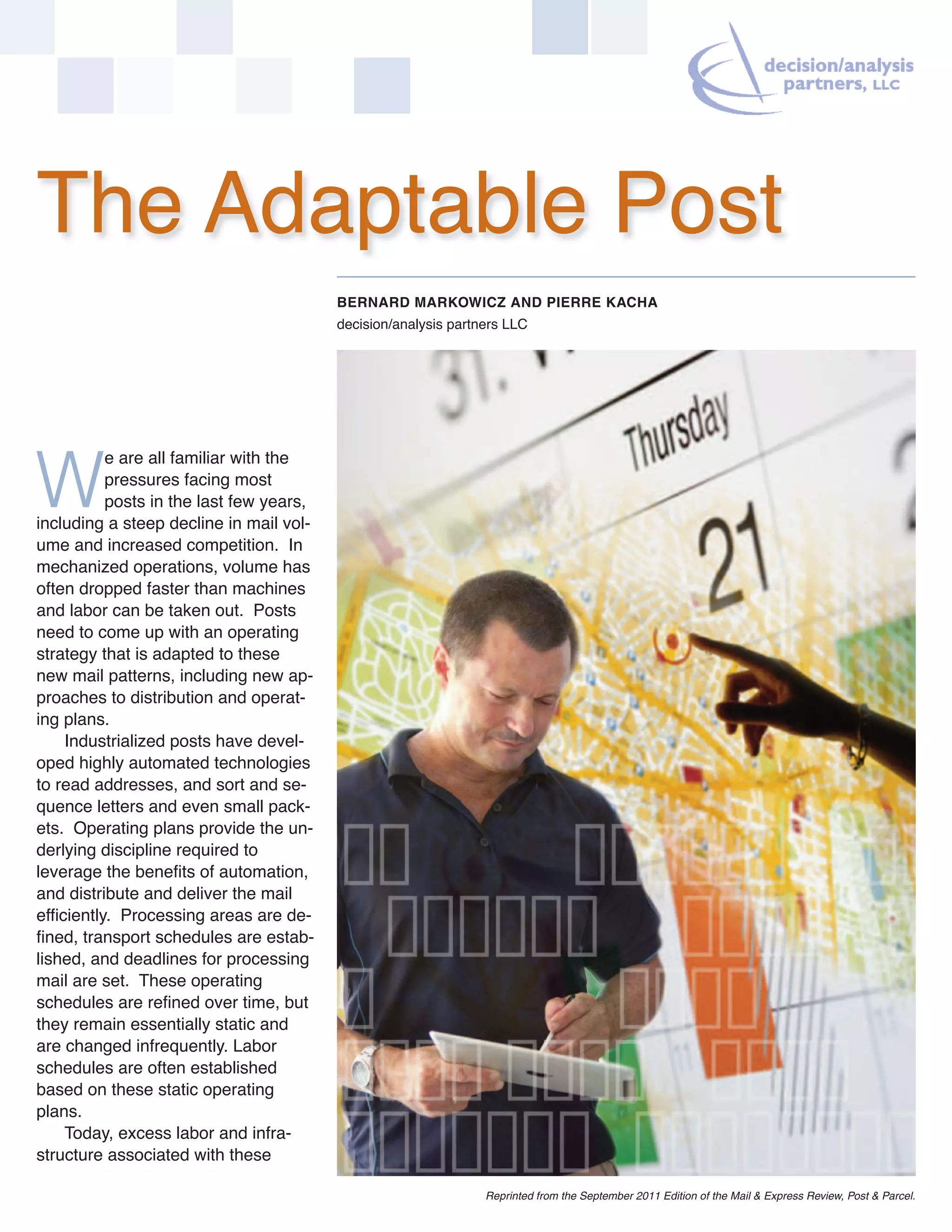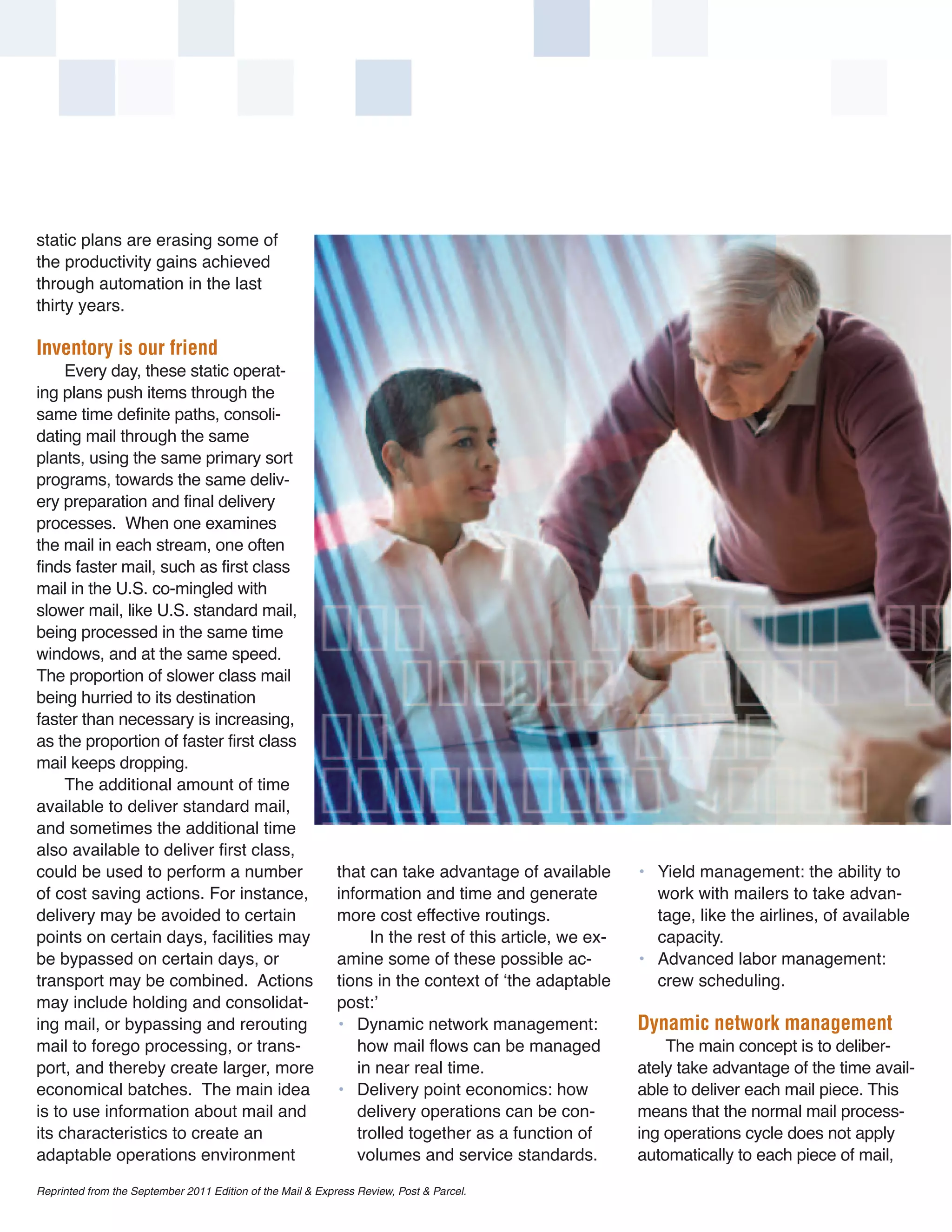 This document discusses strategies for making postal operations more adaptable to changing mail volumes and patterns. It proposes dynamic network management to reroute mail flows in real time. Delivery point economics would use detailed mail data to optimize delivery routes and schedules. Yield management is described as using capacity pricing to incentivize mailers to send mail on lower volume days, maximizing efficiency. The adaptable post aims to leverage unused capacity and mail characteristics for more cost-effective operations.